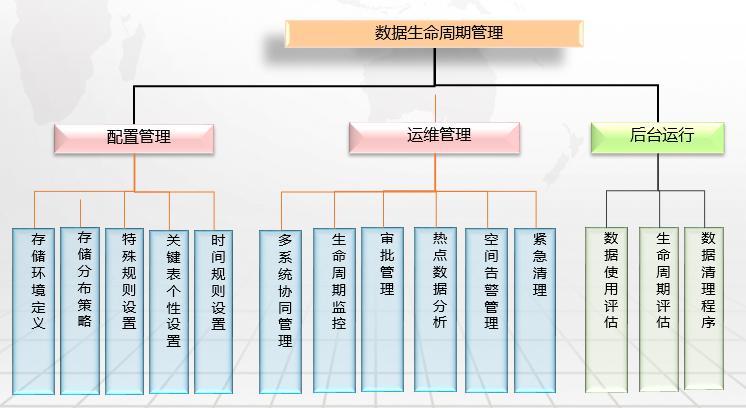 數(shù)據(jù)資產(chǎn)地圖可進行生命周期管理 數(shù)據(jù)的生命周期包括:新建,正常,轉存儲,壓縮,轉帶庫,刪除等狀態(tài)。多系統(tǒng)協(xié)同生命周期管理.可以制定在不同的庫不同的存儲策略。如最近數(shù)據(jù)和歷史數(shù)據(jù)分布策略。支持系統(tǒng)自動管理,自動清理,同時對一些重點的表進行手工審批管理
